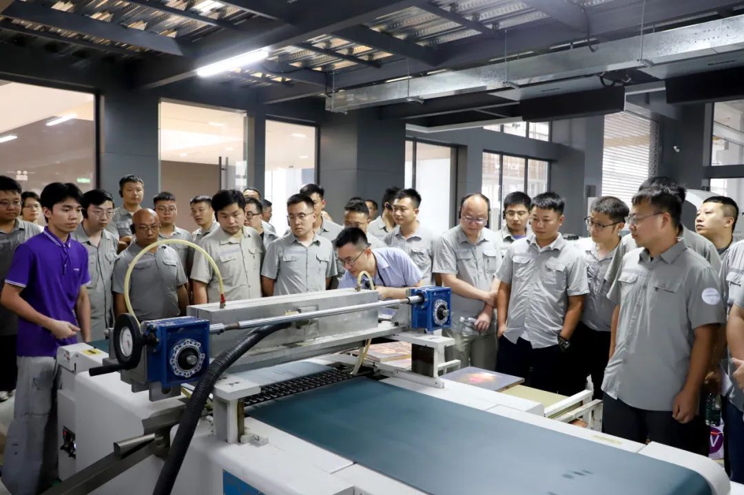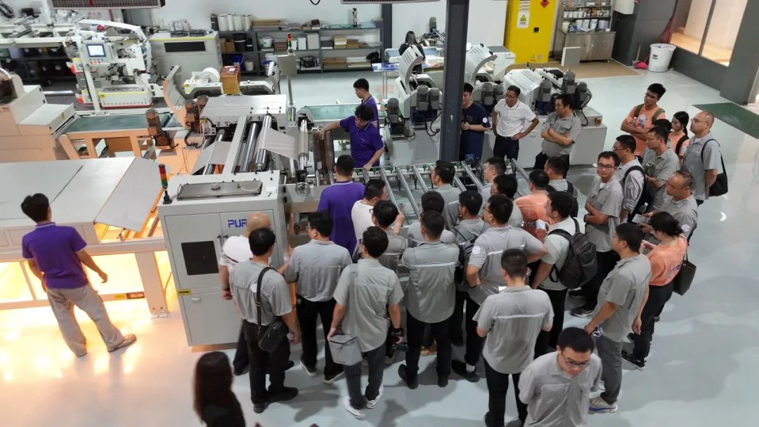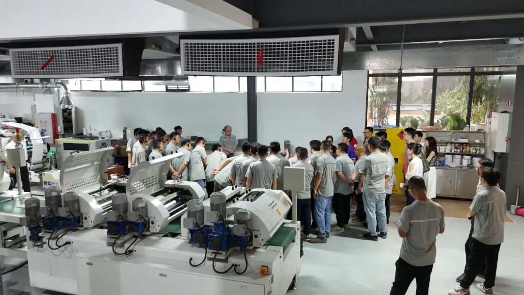 考察團(tuán)分成兩組深入生產(chǎn)一線,開(kāi)啟深度參觀。在專(zhuān)業(yè)引導(dǎo)員的引領(lǐng)下,從機(jī)加車(chē)間到裝配1車(chē)間,再裝配3車(chē)間內(nèi),先后參觀了輥涂、淋涂、噴漆、平貼、平壓等各個(gè)產(chǎn)線設(shè)備。這些先進(jìn)的設(shè)備和智能化的生產(chǎn)流程,讓工程師們對(duì)表面涂飾工藝有了更直觀的認(rèn)識(shí),也感受到了普瑞特在智能制造領(lǐng)域的強(qiáng)大實(shí)力。